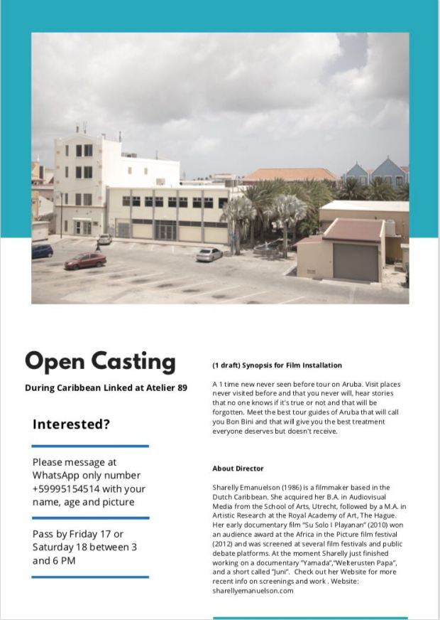 For a new film installation, Director/Artist Sharelly Emanuelson is looking for male & female tour guides and/or actors on Aruba. Average ages must be Adults 25+, 40+ and 60+. For the casting, one must have either great tour guide experience/skills on Aruba or acting experience.