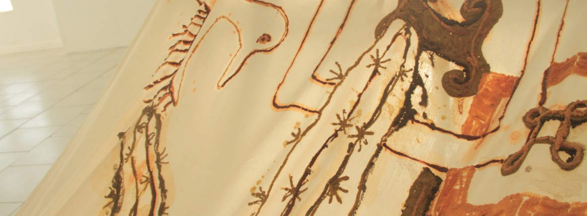 Conversation #2 is the third work of the ongoing project “Odour”. The artwork is the smell. Smell is for me an air, which you can’t see it but you can feel it and smell it. In this work, by presenting the smell as an installation, I build the table feet with the dry leaves, a table cloth and spices. I was looking for a real Aruban food, which is made of real Aruban spices. It was disappointing to use the same spices I use in my cuisine. That was the curry, pepper, garlic and cumin. So I start looking further for other inspiration. I was inspired by the nature. It was hot and dry. So I started capturing elements of the nature where I was thinking of real Aruba, the cactus, the Arikok Park, the first cave drawing, the goat and the rocks. I made a line drawing by layering all the sketches I took.