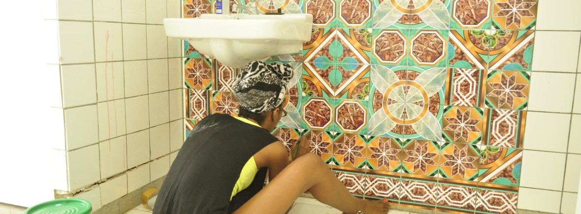 It was visiting master artist Humberto Díaz who advocated for Hunter leaving her comfort zone as she considered ways of working with tiles. Díaz spent many of his visits with Caribbean Linked IV’s residents encouraging them to try things they’d never tried before. If an artist had mostly made 2-D works in the past, Díaz recommended producing something three-dimensional. If an artist was attached to representational work, he argued for abstraction. In the case of Hunter’s collages, Díaz asked if the artist had ever considered creating her pieces digitally.
