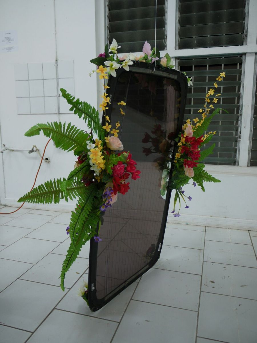 Laura de Vogel, Mane un Bouquet/Bukét Di Flor Cu Wowo Sera, Installation with glass, tinted car windows, mirror, fake flowers, photographs & window tint, 2016. Photo courtesy of Nowe Harris Smith Previous Next Published September 9, 2016 at 1056 × 1408 in Gallery Like Loading...