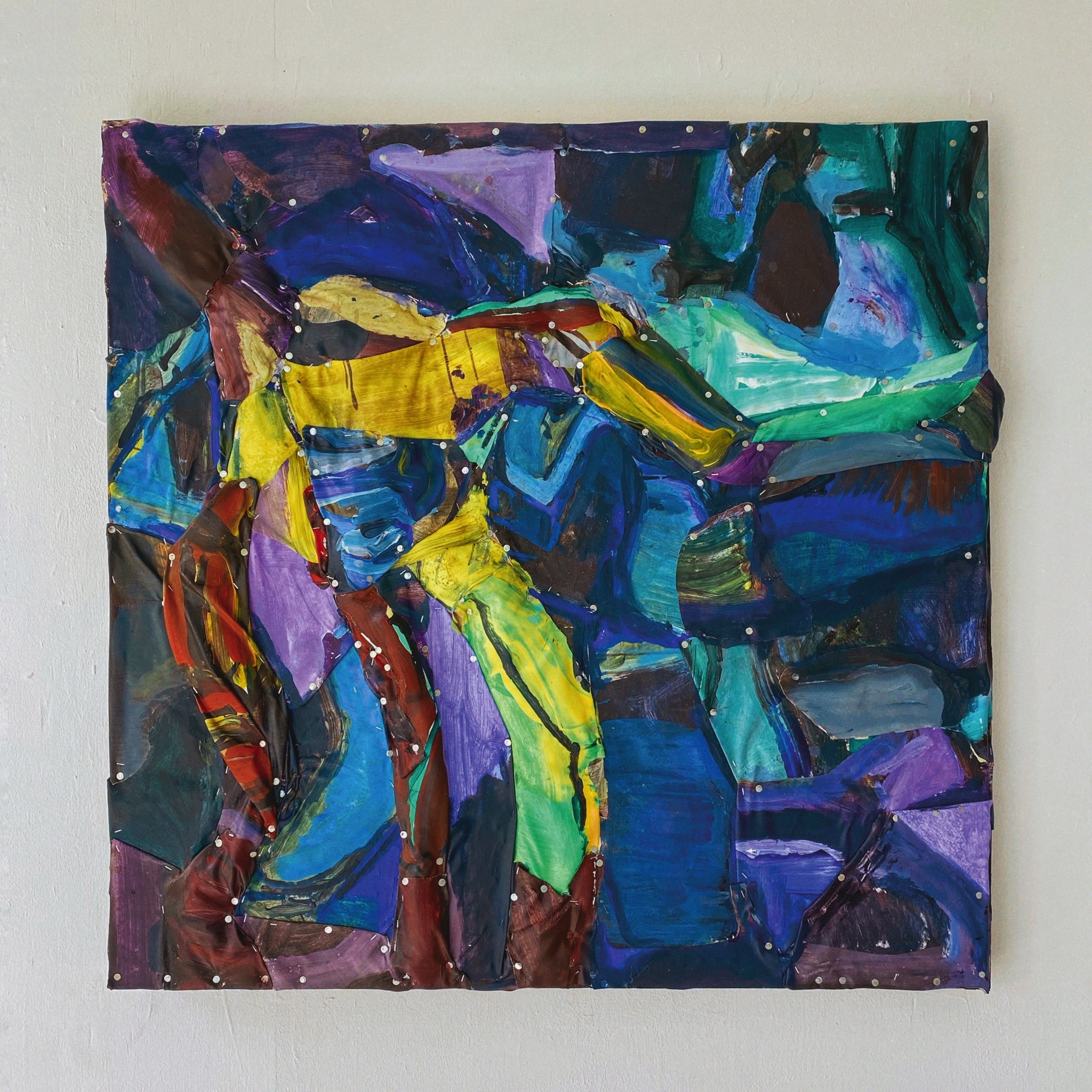 1 Previous Next Published September 6, 2022 at 2048 × 2048 in John Reno Jackson Underneath the kwihi tree, acrylic, charcoal, acrylic medium on imitation suede attached over nails, acrylic glue, staples, fabric on reclaimed wood, 2022.